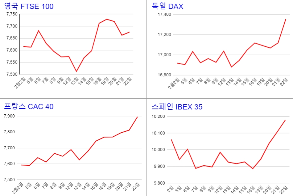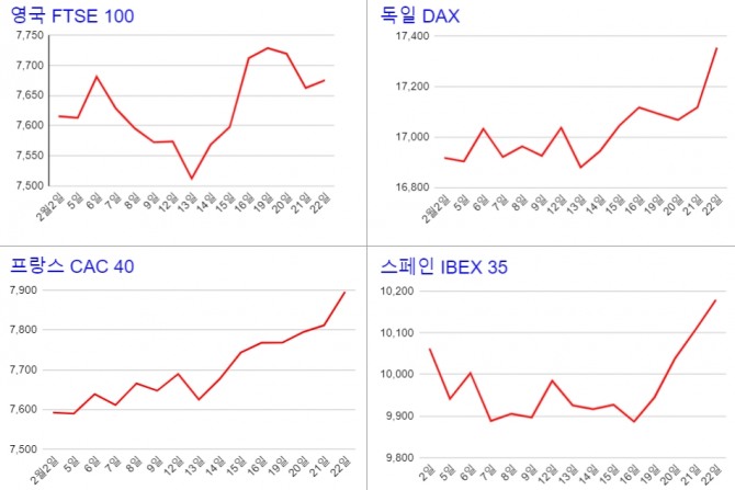22일 오전 9시10분(현지시각) 현재 독일 DAX 지수는 1.37%(235.56포인트) 상승한 1만7353.48을 기록 중이며, 프랑스 CAC 40 지수 역시 1.08%(84.26포인트) 상승한 7896.35를 기록하고 있다.