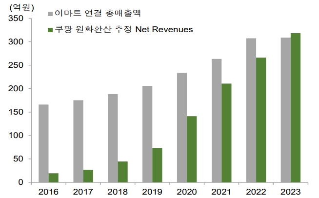 이미지 확대보기29일 금융투자업계에 따르면 쿠팡은 작년 연간 순매출액이 31조원을 넘었다. 이는 이마트의 연결 총매출액(30조8800억원)을 넘는 수치다. 중요한 건 쿠팡은 순매출액으로 이마트의 연결 매출액(조선호텔, 신세계 등 포함)을 상회했다는 것이다.