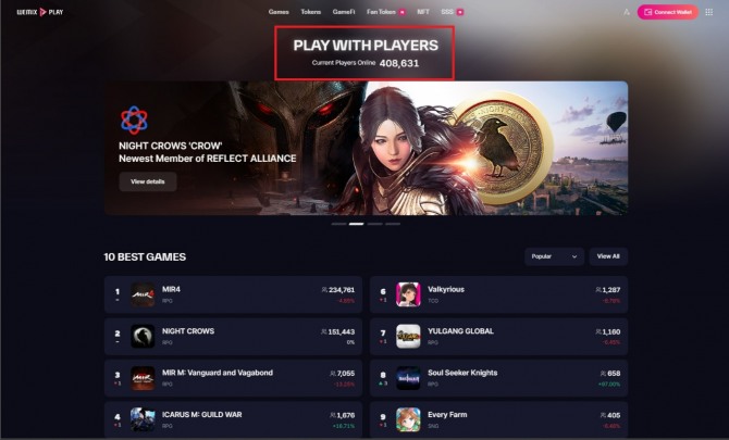 다만 블록체인 게임 플랫폼인 '위믹스 플레이' 입장에서는 나이트 크로우가 플랫폼 내 '양날의 검'이 될 가능성도 있다. 13일 오전 기준 약 40만명 이상이 접속한 위믹스 플레이에는 플레이 가능한 블록체인 게임 33종이 있다. 그 중 미르4 글로벌에 23만여 명, 나이트 크로우에 약 15만여 명, 미르M: 뱅가드 앤 베가본드에 7000여 명이 접속 상태였다. 전체 접속자 중 90% 이상이 위메이드의 MMORPG '3대장'을 즐기는 셈이다. 플랫폼의 확장과 게임 다양성이 아직 개선돼야 할 것으로 보인다.