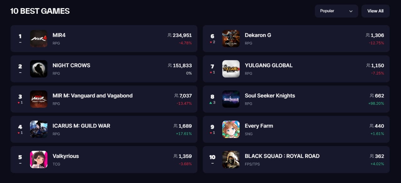 나이트 크로우를 즐긴 유저 수도 13일 오전 한때 15만명을 넘어섰고, 최고 16만명을 돌파했다. 플랫폼에서 사용자가 가장 많은 '미르4' 글로벌에 이은 인기 2위를 기록 중이다.