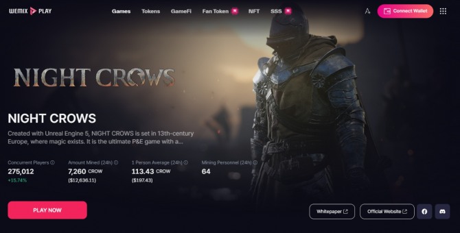 블록체인 P2E 게임에 대한 심의가 나지 않는 국내와 달리 해외에서는 P2E(게임하며 돈 벌기) 기능이 더해져 출시된 탓에 '나이트 크로우'는 블록체인 게임으로도 각광받고 있다. 무엇보다 '나이트 크로우'는 위메이드의 블록체인 게임 플랫폼 '위믹스 플레이'에서 수 년째 부동의 1위였던 '미르4' 글로벌의 인기를 제치고 당당히 1위 자리를 차지했다.