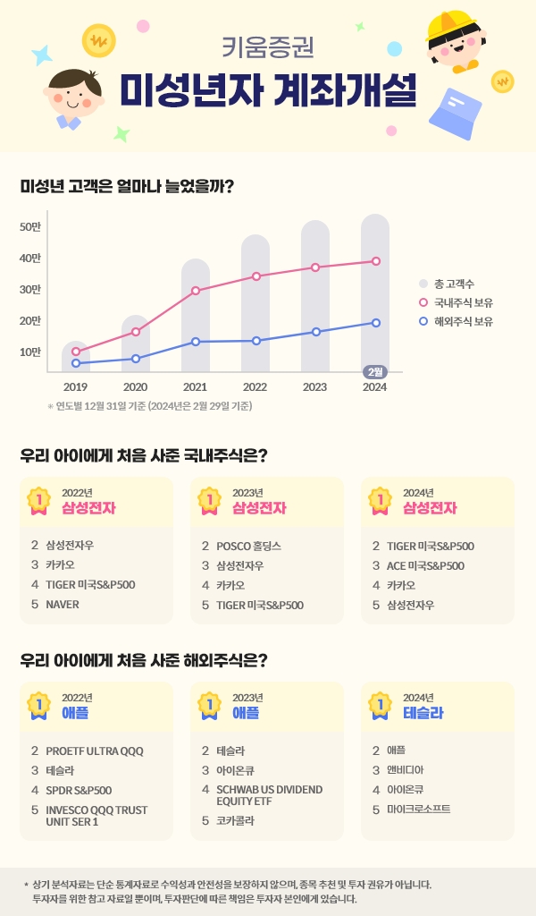 그 중 국내주식과 해외주식을 보유하고 있는 고객도 각각 24만명, 8만명을 넘어 실제 투자에 참여하는 고객 비율도 높다고 덧붙였다. 2019년 대비 미성년 전체 고객 수는 약 14배, 국내주식과 해외주식을 보유한 고객 수는 각각 15배, 80배가량 증가한 수치다.