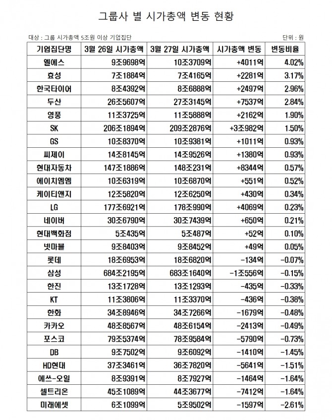 한편, 미래에셋그룹은 시가총액 1595억원 감소하면서 그룹 시가총액 6조원대가 무너지면서 가장 부진했다.