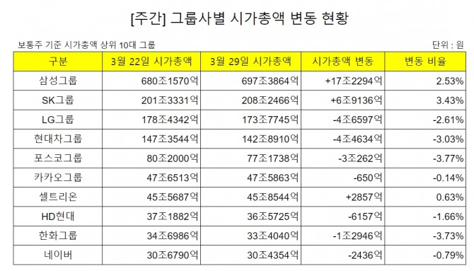 1위 SK그룹 +6조9136억 (3.43%), 2위 삼성그룹 +17조2294억 (2.53%), 3위 셀트리온 +2857억 (0.63%), 4위 카카오그룹 -650억 (-0.14%), 5위 네이버 -2436억 (-0.79%), 6위 HD현대 -6157억 (-1.66%), 7위 LG그룹 -4조6597억 (-2.61%), 8위 현대차그룹 -4조4634억 (-3.03%), 9위 한화그룹 -1조2946억 (-3.73%), 10위 포스코그룹 -3조262억 (-3.77%)