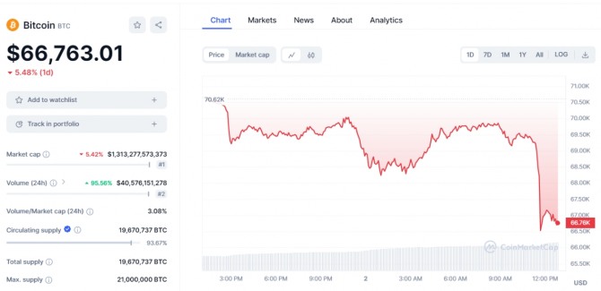 이미지 확대보기2일 오후 12시 50분 현재 글로벌 코인 시황 중계사이트 코인마켓캡에 따르면, 비트코인은 24시간 전보다 5.44% 급락한 6만6747달러로 거래 중이다.