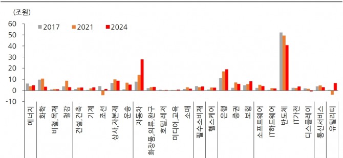 한화투자증권에 따르면 올해 당기순이익이 이전 실적 고점이었던 2017년과 2021년 대비 증가할 것으로 예상되는 업종은 자동차와 은행이다. 반도체 약세 국면에서 대안이 될 수 있다는 설명이다. 원/달러 환율 상승은 자동차 실적 전망을 높이고 은행은 이달 들어 조정을 받아 가격 메리트가 부각되고 있다.