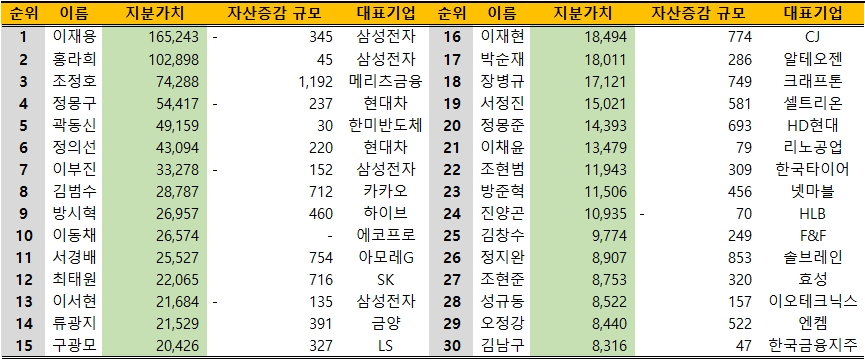 이재현 CJ그룹 회장의 지분가치는 전 거래일 대비 774억원 늘어난 1조8494억원으로 집계됐다. 이재현 회장은 이달 중순까지 10위권 후반에 랭크됐지만 지분가치가 점차 증가하면서 이날 16위를 기록했다.