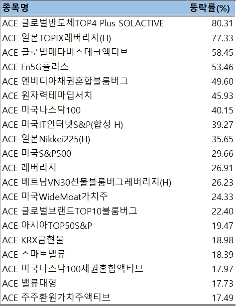 4위를 기록한 상품은 'ACE 글로벌반도체TOP4 Plus SOLACTIVE'(80.31%)로 한국투자신탁운용이 담당하고 있다.
