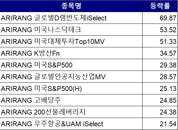 지난 1년 간 수익률이 가장 높은 ETF는 ‘ARIRANG 글로벌D램반도체iSelect’(69.87%)로 전체 ETF 중 12위에 랭크됐다.