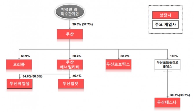 두산은 두산에너빌리티, 두산로보틱스, 오리콤 등을 자회사로 두고 있다. 이중 두산에너빌리티는 두산퓨얼셀과 두산밥캣을 지배하고 있어 사실상 두산에너빌리티가 두산 신용도에 미치는 영향이 지대하다.
