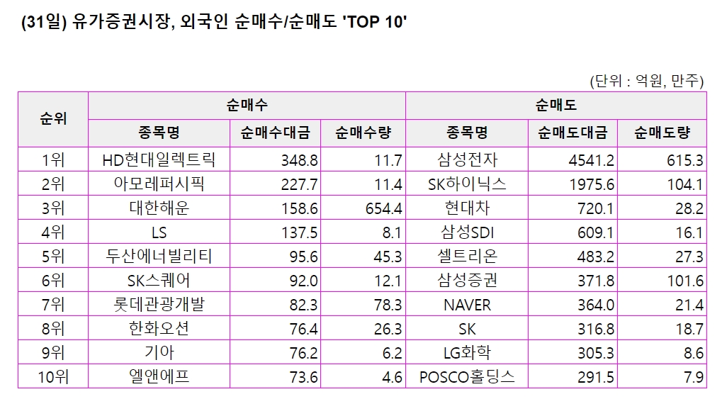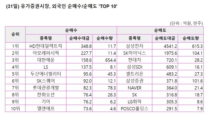 31일 집계 기준 유가증권 시장 외국인 투자자 순매수 상위 10개 종목과 순매수 금액은 다음과 같다.