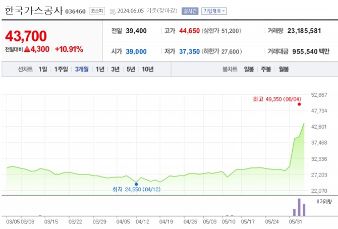 이미지 확대보기5일 한국거래소에 따르면, 윤석열 대통령의 석유 매장 가능성 발표 첫날인 지난 3일 상한가를 기록한 한국가스공사는 이날 장중 한때 5.20% 까지 밀리기도 했지만 10.91% 상승한 4만3700원에 거래를 마감해 눈길을 끌었다.