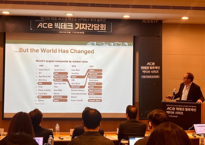 세미나의 첫 번째 발표자는 '돈은 빅테크로 흐른다'의 저자이자 그래비티자산운용 대표인 아담 시셀이 맡았다. 아담 시셀 대표는 "세상은 변화하고 있다"며 "1990년대에는 IT 기업 중 시가총액 10위권에 이름을 올린 곳이 단 두 곳에 불과했지만, 2020년대에 들어서는 8개의 기업이 시가총액 10위권 내에 있는 것은 물론 시가총액 1~3위를 차치하고 있다(2021년 기준)"고 설명했다.