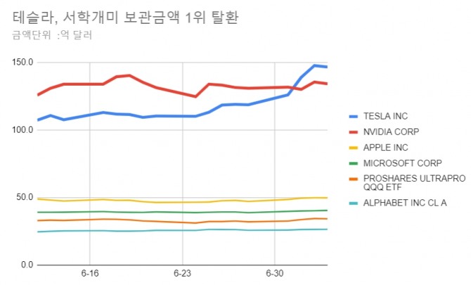 이미지 확대보기최근 테슬라 주가가 반등하면서 지난 2일 엔비디아를 제치고 국내 투자자들이 가장 많이 보유한 해외 주식 1위 자리를 되찾았으며, 3일 연속 1위자리를 유지하고 있다.