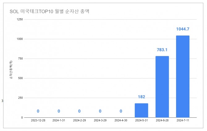 이미지 확대보기12일 한국거래소에 따르면 SOL 미국테크 TOP10 ETF의 순자산은 지난 11일 처음으로 1000억원을 돌파해 1044억원을 기록했다. 수익률은 최근 50일 사이 18.86% 급등했다.