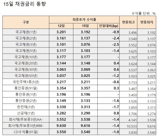 이미지 확대보기15일 서울 채권시장에서 3년 만기 국고채 금리는 전 거래일보다 2.5bp(1bp=0.01%포인트) 내린 연 3.076%에 장을 마쳤다. 이날 마감 금리는 연중 최저치에 해당한다.