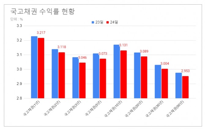 24일 서울 채권시장에서 3년 만기 국고채 금리는 전 거래일보다 3.8bp(1bp=0.01%포인트) 내린 연 3.046%에 장을 마쳤다.