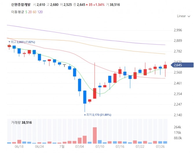 신원종합개발은 7월 6일 이후 강세를 이어가면서 이달 하락폭 대부분을 만회했고, 지난달 말 종가 2650원 회복을 눈앞에 두고 있다.