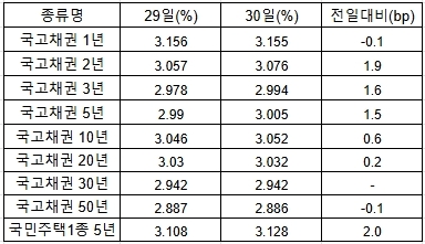 이미지 확대보기30일 서울 채권시장에서 3년 만기 국고채 금리는 전 거래일과 보다 1.6bp 상승한 연 2.994%에 장을 마쳤다.