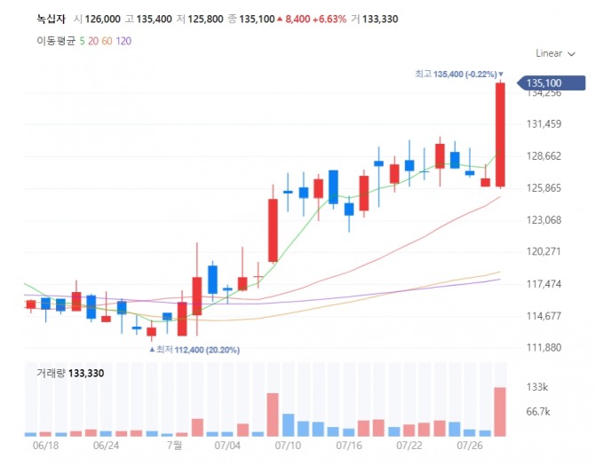 녹십자 뒤를 이어 한국항공우주, CJ 종목도 각각 4.58%, 4.36%씩 상승해 상승률 상위권에 이름을 올렸다.