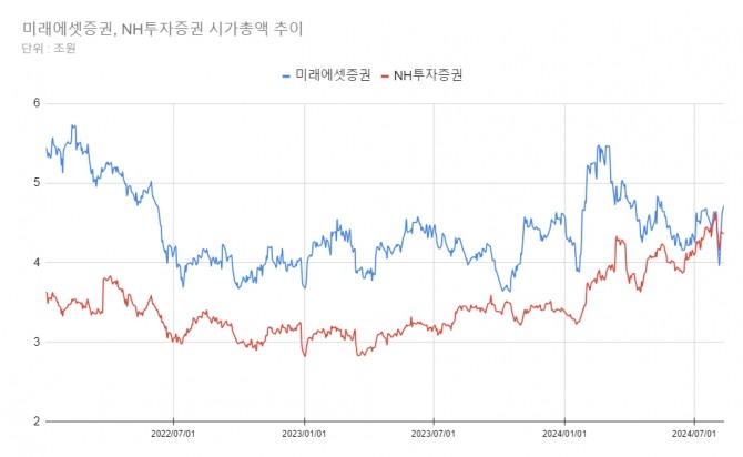 NH투자증권은 올해 1월만 해도 시총이 3조3600억원 수준이었다. 하지만 NH투자증권이 2주 먼저(7월25일) 상반기 실적 개선과 주주환원정책을 공개하면서 지난 1일 52주 신고가를 갱신해 시총 4조6405억원을 기록하며 미래에셋증권(4조5720억원)을 제치고 시총 1위에 등극한 바 있다.