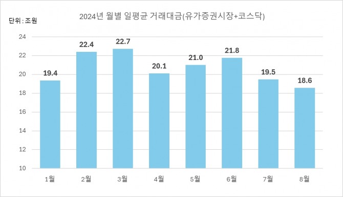 이미지 확대보기25일 글로벌이코노믹이 올해 일평균 거래대금을 분석한 결과 8월 중 일평균 거래대금은 18조6000억원으로 올들어 월별 기준으로 최저치를 기록했다.