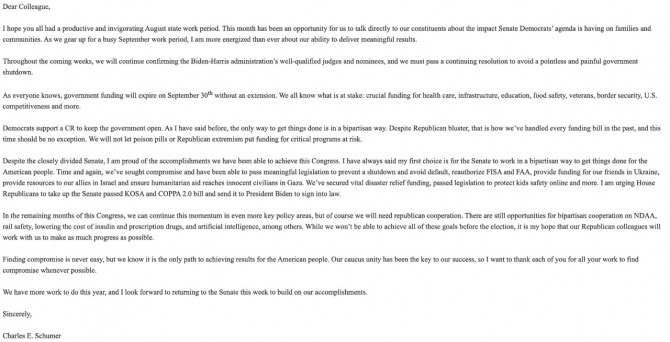 이미지 확대보기9일(현지시각) 폭스비즈니스 기자 엘리노어 테렛(Eleanor Terrett)은 자신의 SNS인 X를 통해 "미국 상원 민주당 원내대표 척 슈머(Chuck Schumer) 의원이 동료 의원들에게 보낸 서한에서 초당적 법안 통과 우선순위를 언급했다. 여기서 인공지능(AI)은 포함됐지만 암호화폐 법안은 빠졌다”라고 전했다.