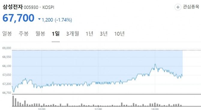 이날 삼성전자는 오후 2시57분 기준 전일대비 1200원(1.74%)하락한 6만7700원에 거래되고 있다.