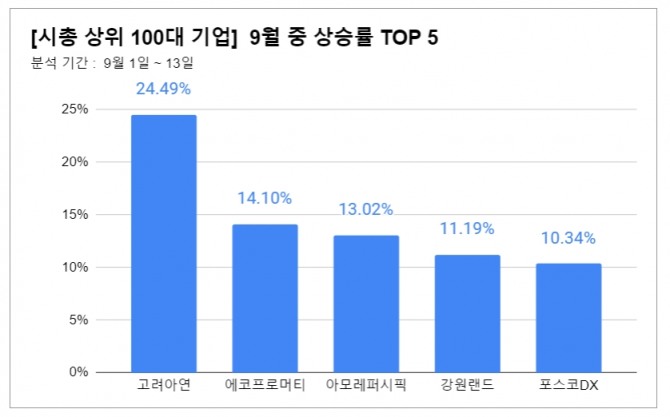 이미지 확대보기18일 글로벌이코노믹이 시가총액 상위 100대 기업의 9월 주가등락률을 분석한 결과 고려아연은 24.49% 급등해 상승률 1위를 기록했다.