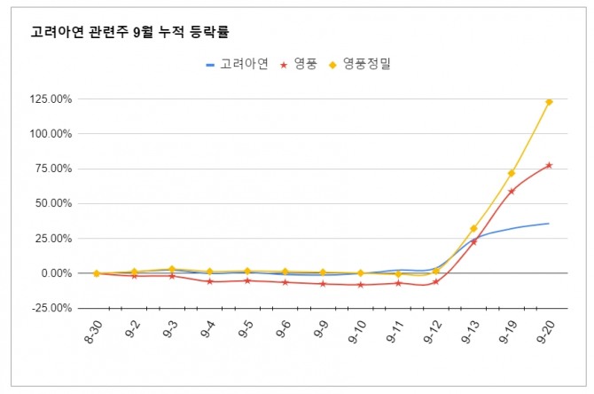 고려아연과 함께 공개매수를 추진 중인 영풍정밀은 연일 상한가를 기록하며 이달 들어 100%가 넘는 주가 상승률을 기록중이다.