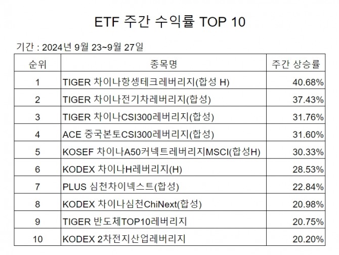 2위는 'TIGER 차이나 전기차 레버리지(합성)'(37.43%)였으며 'TIGER 차이나 CSI300 레버리지(합성)'(31.76%), 'ACE 중국본토 CSI300 레버리지(합성)'(31.60%), 'KOSEF 차이나A50 커넥트 레버리지 MSCI(합성H)'(30.33%) 등이 뒤를 이었다. 이외에도 KODEX 차이나H레버리지(H), PLUS 심천차이넥스트(합성), KODEX 차이나심천CHiNext(합성)도 20%대 주간 상승률을 기록해 상승률 TOP 10 에 포진했다.
