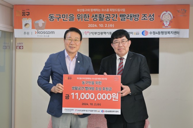 윤창현 코스콤 사장은 지난 2일 부산시 동구 수정동에 위치한 빨래방 3호점에서 열린 ‘부산시 동구 희망드림사업 후원금 전달식’에 참석해 김진홍 부산동구청장에게 후원금을 전달했다.