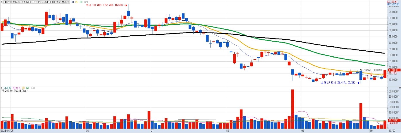 이미지 확대보기7일(현지시각) 뉴욕 주식시장에서 SMCI는 전 거래일보다 15.8% 상승한 47.74달러에 거래를 마치며 20일 이동평균선을 회복했다.