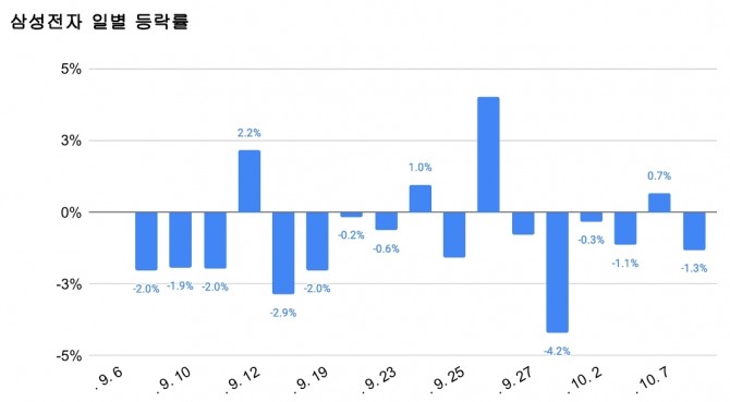 한편 삼성전자의 주가는 지난 9월 한 달간 18.46% 내린데 이어 이달 들어서도 주가 내리막을 벗어나지 못하고 있다.