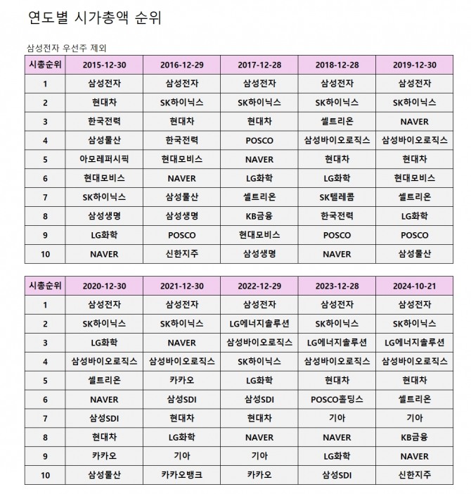 분석기간 동안 삼성전자는 부동의 시총 1위를 지켰으나, 2위의 경우 현대차, SK하이닉스, LG에너지솔루션간 손바뀜이 있었다. 하지만 대부분 SK하이닉스가 2위권을 차지했다.