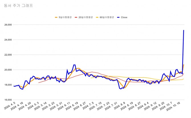 이날 동서는 전거래일 대비 29.94% 상승한 2만5300원에 거래를 마감했다.