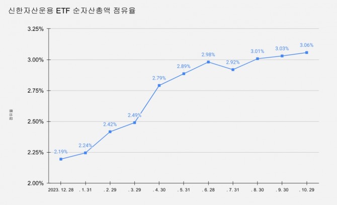 30일 글로벌이코노믹이 집계한 바에 따르면, 29일 기준 신한자산운용의 ETF 순자산 총액은 5조22억원을 기록하고 있다. 이는 ETF 시장 전체 규모의 3.06%에 해당한다.