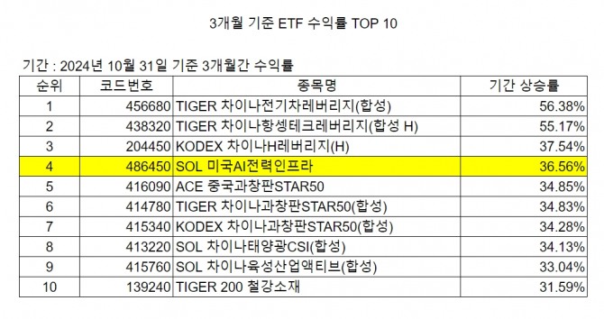 1일 글로벌이코노믹이 지난 31일 기준으로 최근 3개월간 ETF 수익률 상위종목을 분석한 결과 레버리지 ETF를 제외할 경우 SOL 미국AI 전력인프라 ETF의 3개월 수익률은 36.56%로 국내 상장 ETF 중 가장 높은 것으로 나타났다. 레버리지 상품을 포함할 경우에는 타이거 차이나전기차레버리지가 56.38%로 가장 높았다.