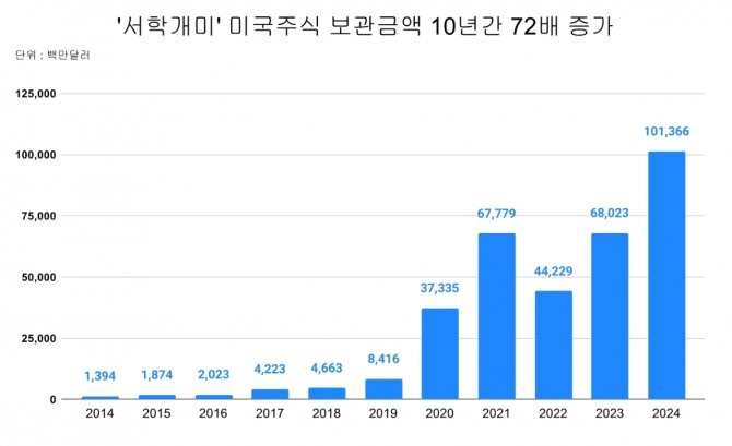 한국예탁결제원에 따르면 지난 7일 기준 국내 투자자들의 미국 주식 보관액은 1013억6600만여 달러로 집계됐다. 이는 10년 전인 2014년 13억9400만 달러와 비교해 72배 증가한 금액이다.