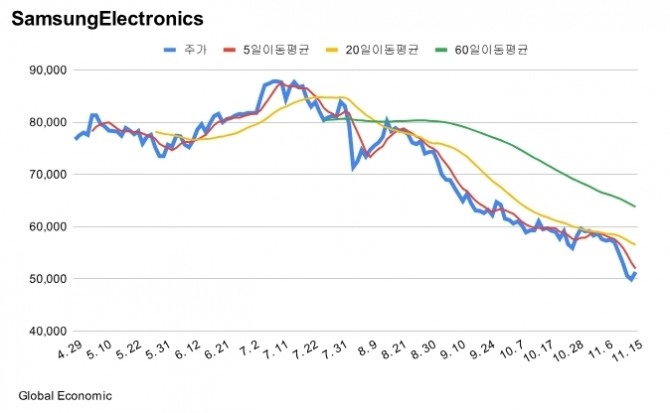 삼성전자 주가는 지난 7일 종가 5만7500원(0.35% 상승)을 기록한 후 5거래일 연속 하락해 전날에는 4만9900원까지 떨어졌다.