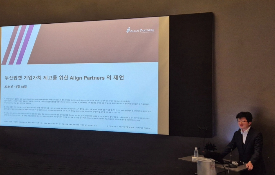 이 대표는 "얼라인과 자본시장의 핵심적인 우려는 두산로보틱스와의 합병 또는 포괄적 주식교환 재추진 계획이 있는 경우 두산밥캣의 주가가 낮아질수록 이익을 보게 되는 지배주주와의 이해상충"이라며 "이러한 합리적 문제 제기에 대한 깊은 고민 없이 단순히 미래 의사결정이 제약되고 기업 경영에 부담되기 때문에 포괄적 주식교환 재추진 포기를 공표할 수 없다고만 말하고 문제에 대한 아무런 해결책을 제시하지 않는 것은 납득하기 어렵다"라고 지적했다.