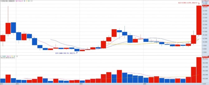 이미지 확대보기24일(현지시각) 뉴욕 주식시장에서 양자 컴퓨팅 선두 아이온큐의 주가는 전 거래일보다 13.32% 급등한 36.50달러에 거래를 마쳤다. 장중 고가는 37.28달러다.