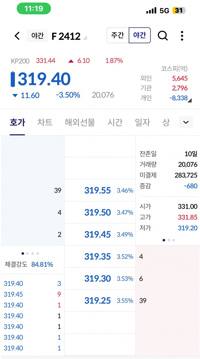 3일 오후 11시 22분 현재 코스피200 야간선물은 3.5% 급락한 319.40에 거래되고 있다.