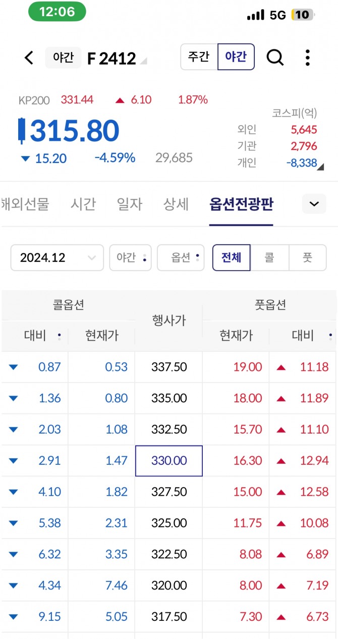 12월물 코스피200 야간선물이 계엄선포 소식이 전해지면서 급락세를 보이고 있다.
