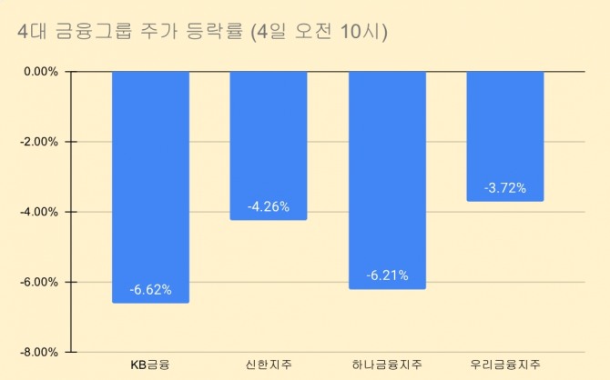이미지 확대보기4일 한국거래소에 따르면, 오전 10시 현재 KB금융지주, 신한금융지주, 하나금융지주, 우리금융지주의 합산 시가총액은 94조4520억원이다.