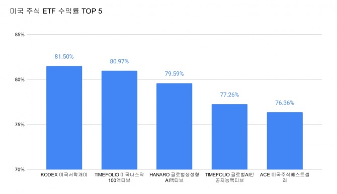 8일 글로벌이코노믹이 지난 5일 기준으로 국내 상장 해외 ETF에 대한 올해 수익률 성과를 분석한 결과 상위 종목의 경우 80%를 넘는 것으로 나타났다.