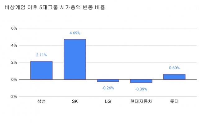 이미지 확대보기15일 한국거래소에 따르면 '비상계엄' 이후 13일까지 국내 5대그룹 보통주 기준 시가총액은 비상계엄 발표 직전에 비해 1.89%(19조3562억원) 증가한 것으로 나타났다.