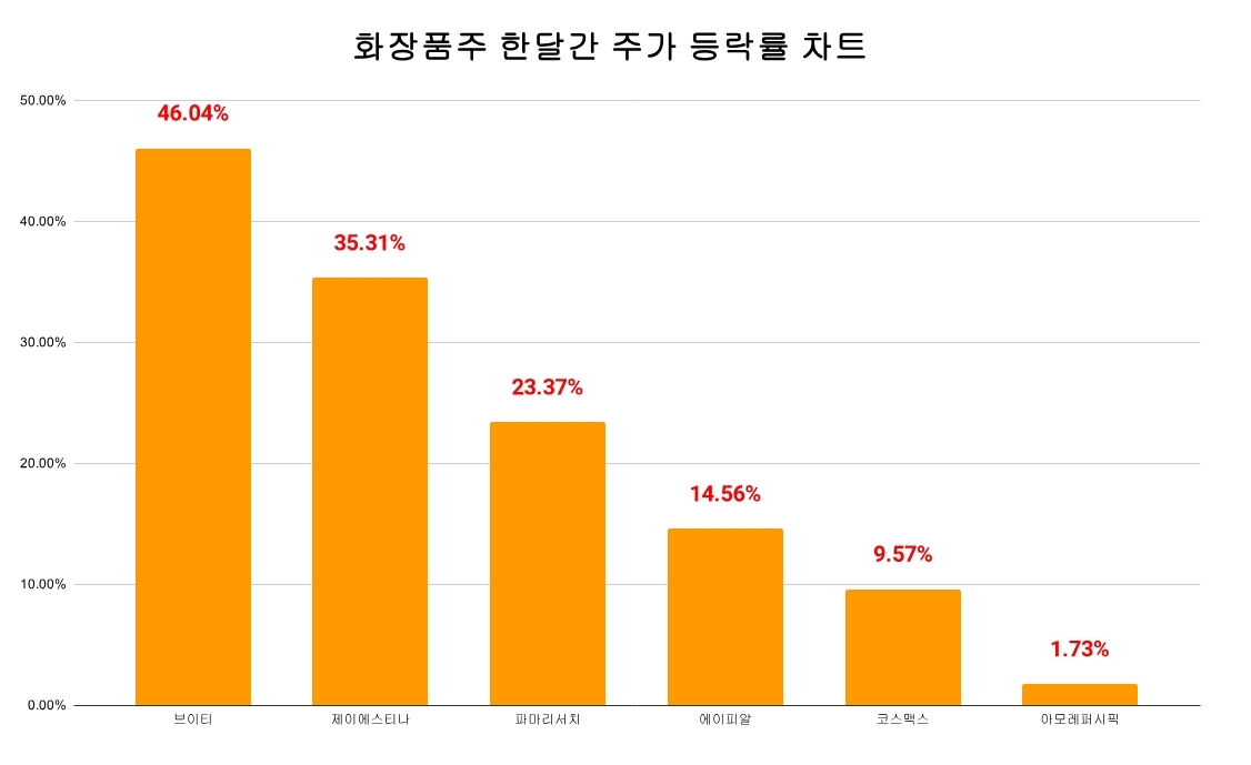 16일 한국거래소에 따르면 최근 한달동안(11월18일~12월16일) 브이티는 46.04%(1만3650원) 상승했다. 이 외에도 제이에스티나(35.31%), 파마리서치(23.37%), 에이피알(14.56%), 코스맥스(9.57%), 아모레퍼시픽(1.73%) 등 화장품 관련 종목이 일제히 상승했다.