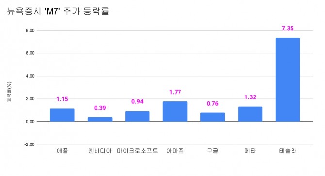 이미지 확대보기24일(현지시각) 뉴욕 주식시장에서 매그니피센트7(M7·애플, 아마존닷컴, 알파벳, 마이크로소프트, 메타 플랫폼, 테슬라, 엔비디아) 종목이 일제히 상승한 가운데 테슬라는 7.35% 급등해 가장 뛰어난 성과를 나타났다. 이날 하루동안 테슬라 시가총액은 한화로 약 143원(992억 달러) 가량 급증했다.