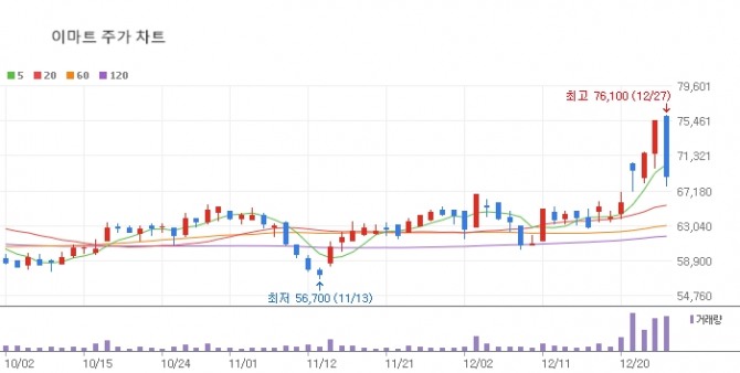 이미지 확대보기27일 한국거래소에 따르면 이날 오전 9시25분 현재 이마트는 유가증권시장에서 전장 대비 9.27% 내린 6만8500원에 거래되고 있다. 주가는 7만6000원으로 출발한 후 매물이 쏟아지면서 급락했다.